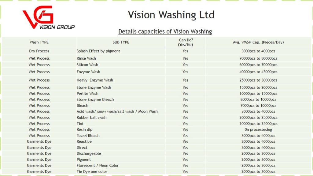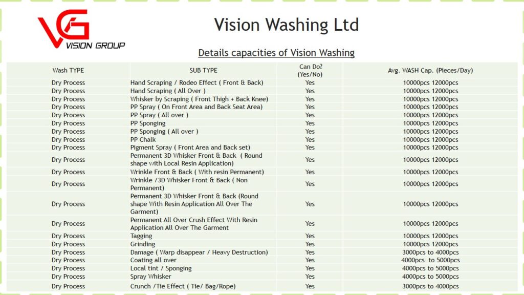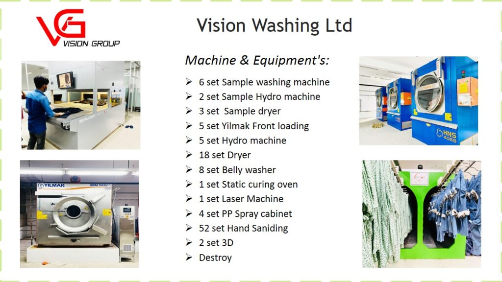 Vision Washing Ltd.is a pioneer washing plant that caters for a complete range of all dry & wet processes. It is the most recognized washing plant in the RMG sector in Bangladesh. It has over 09 years of washing experience in its own well managed facility. The facility,equipped with a modern Effluent Treatment Plant (ETP) is capable of handling around 15,000 pieces of denim washes. It has extensive dry process capabilities. The management is concerned about the constant need for upgrading its equipment. The company is working closely with machine suppliers from China and Turkey, the well-known places for wash expertise, to enhance its machines gradually.